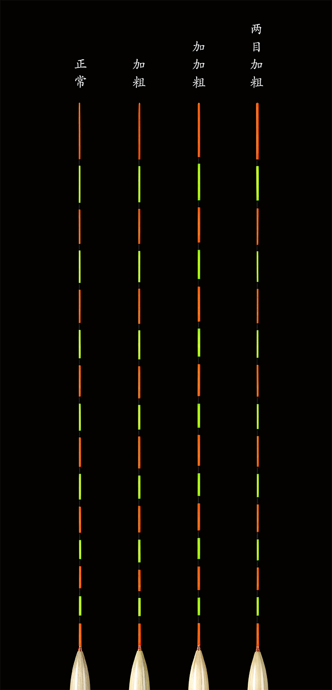 正常漂尾、整體加粗漂尾及兩目加粗漂尾,均可根據(jù)釣友需要更改漂尾目數(shù),加長(zhǎng)或縮短示目距離。